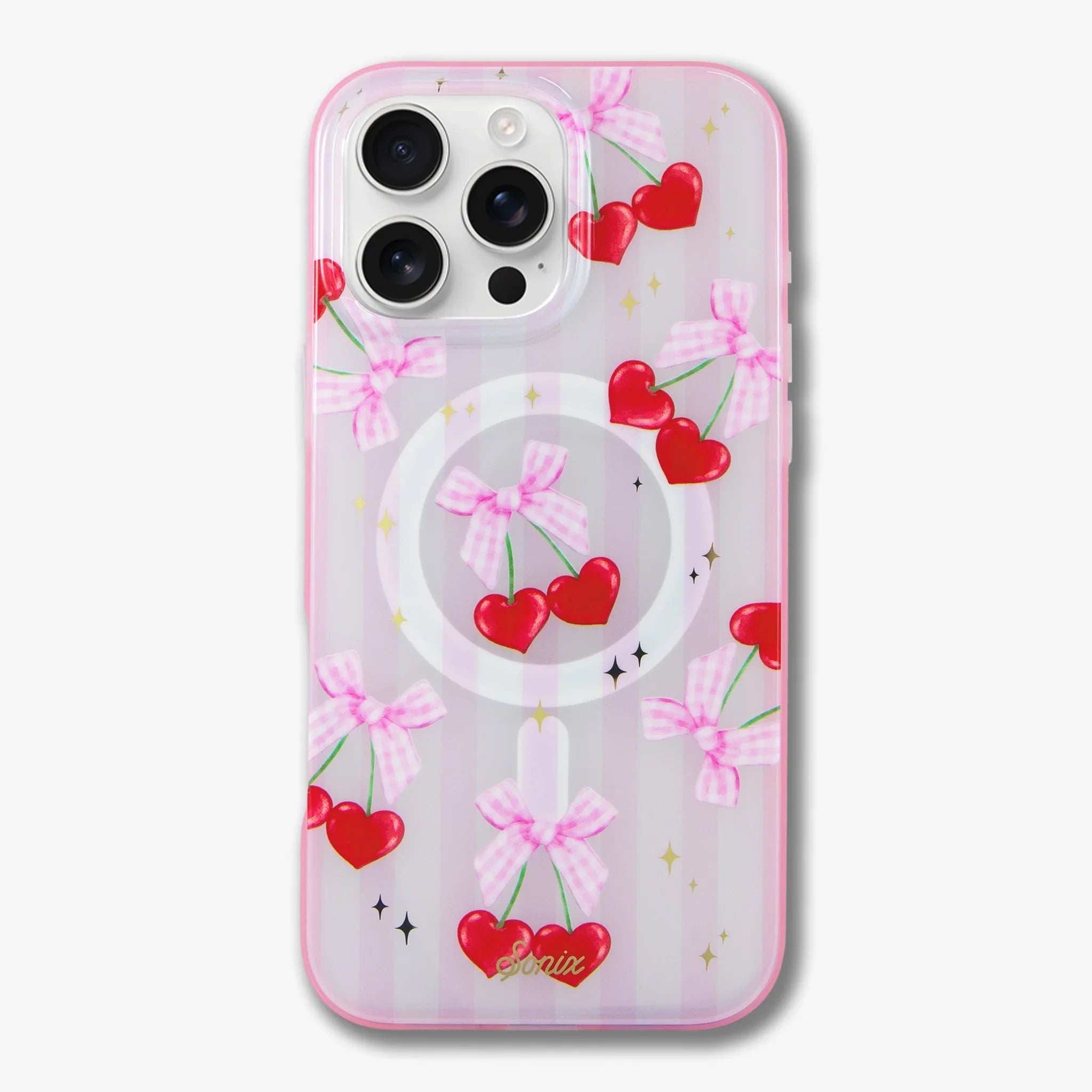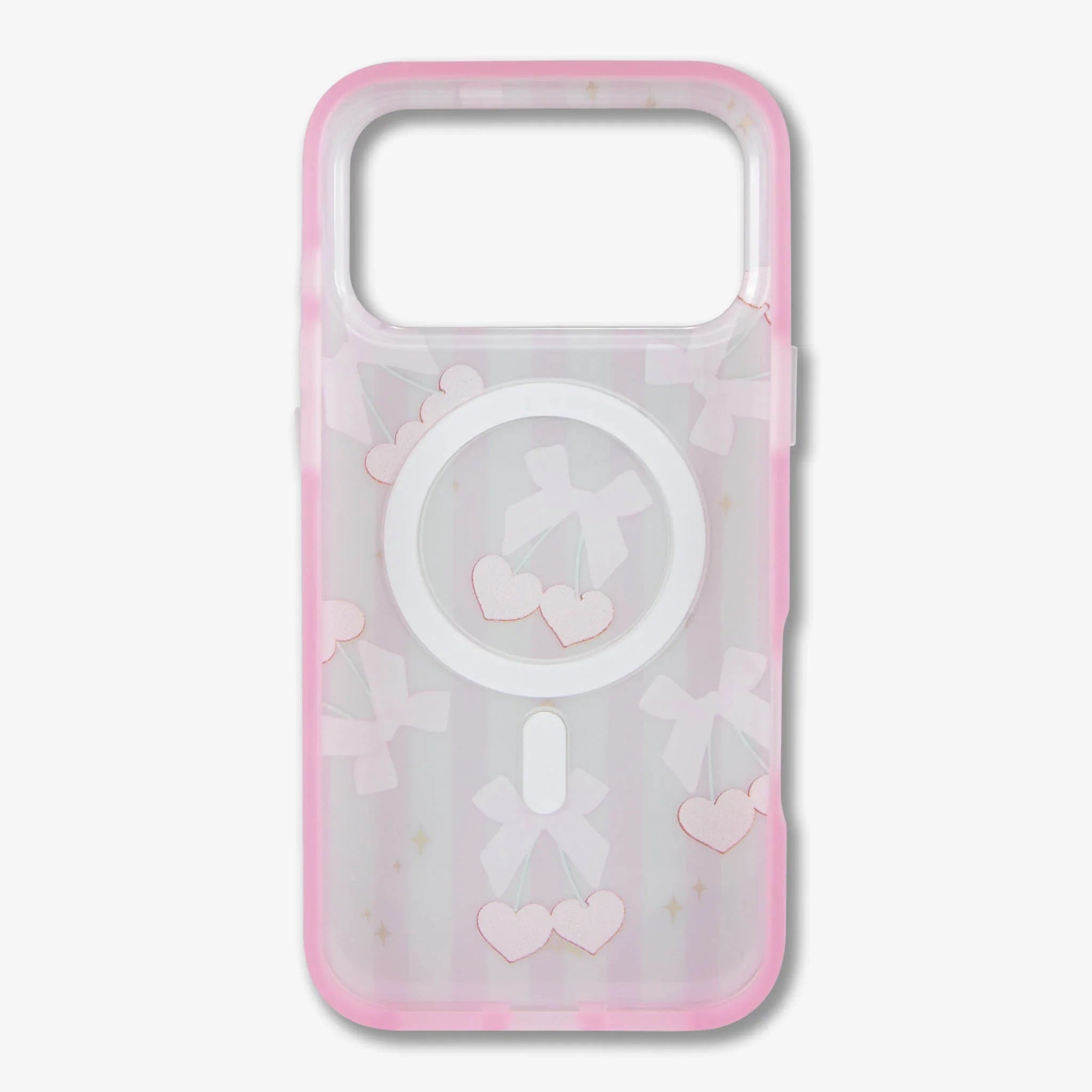 This case nails the coquette aesthetic, with flirty pairs of juicy, heart-shaped cherries tied together with pink gingham bows. Subtle stripes of pink and white grace the background of this charming case, while gold accent twinkles round out this charismatic design. For the flirt, who’s also prone to flattery, this pretty and protective phone case is for you! The Coquette Cherries MagSafe® compatible iPhone case is sweet and alluring and will arouse the admiration of all who come into contact with this ultra-flirty print!