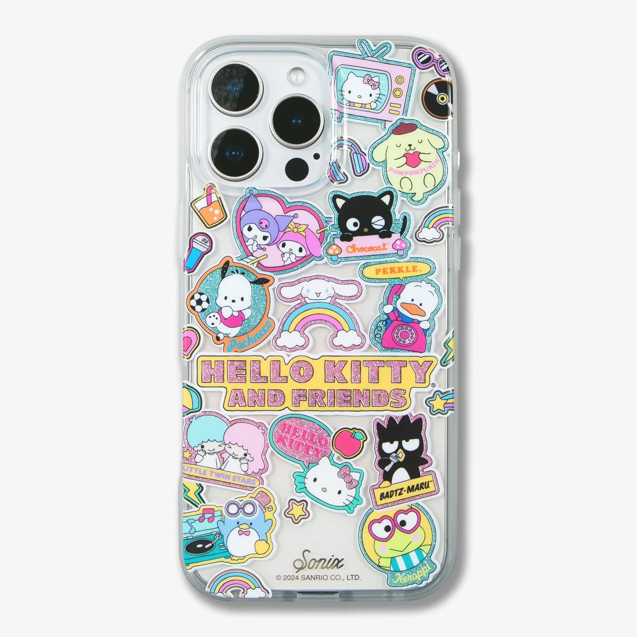 Find your favorite Hello Friends, including My Melody ™, Kuromi ™, Pekkle ™, Pompompurin ™, Chococat, Cinnamoroll ™, Pochacco ™, LittleTwinStars ™, Badtz-Maru ™, Keroppi ™, and Tuxedosam ™ situated in a multi-colored glitter party with accents of our signature gold foil.