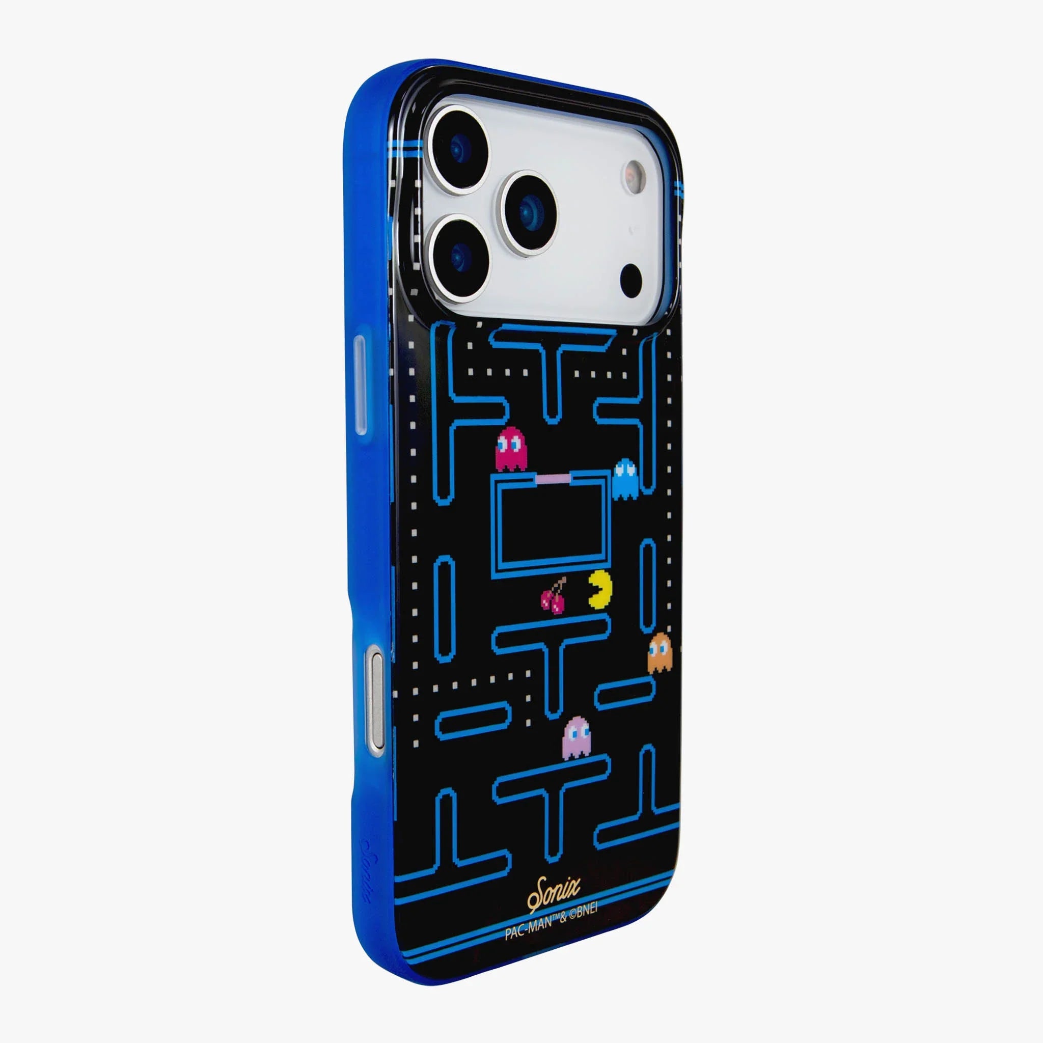 Step back in time with the Pac-Man™ Classic iPhone case, featuring an iconic retro design inspired by the legendary arcade game. This sleek black case showcases the classic Pac-Man™ maze with vibrant blue pathways, complete with Pac-Man™, colorful ghosts, and power pellets, all rendered in pixel-perfect detail. A bold blue bumper accents this unique and playful case, a fun and colorful feature. Perfect for gaming enthusiasts and nostalgia lovers, this case brings a piece of arcade history to your iPhone. Add a dose of nostalgic fun to your iPhone with this Pac-Man™ Classic MagSafe® compatible case! This is arcade nostalgia and classic gaming at its finest!